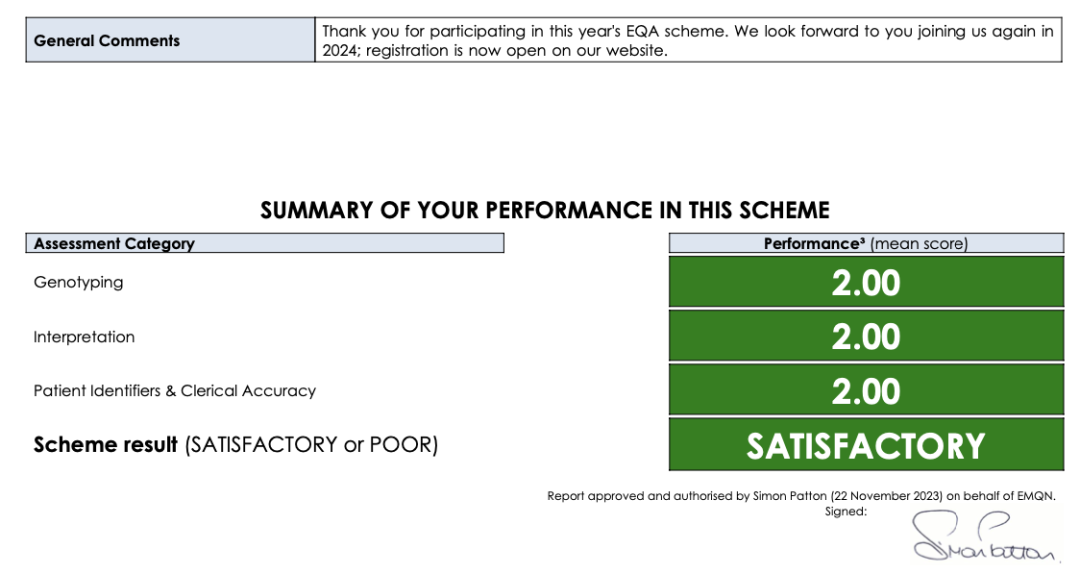 EMQN(European Molecular Quality Network)是一个非营利组织,致力于提高实验室间质量评价和质量控制方法。EMQN室间质量评价是基于分子诊断实验室的质量控制,旨在评估不同实验室之间的分析一致性和准确性。其考核结果反映实验室技术的准确性、质量管理的规范性以及检测服务的专业性,是全球分子遗传学临床实验室最高水平的认证标准之一。