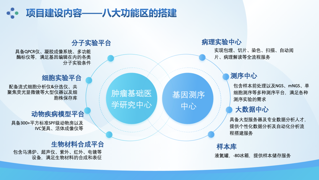 我司公共服务平台包括分子实验平台、细胞实验平台、动物疾病模型平台、生物材料合成平台、病理平台、测序平台和大数据中心、生物样本库等用于支撑肿瘤精准医疗研究与临床监测的全部平台及相应设备仪器,为肿瘤精准医学的科学研究、病理或临床监测提供充足的保障和支持。